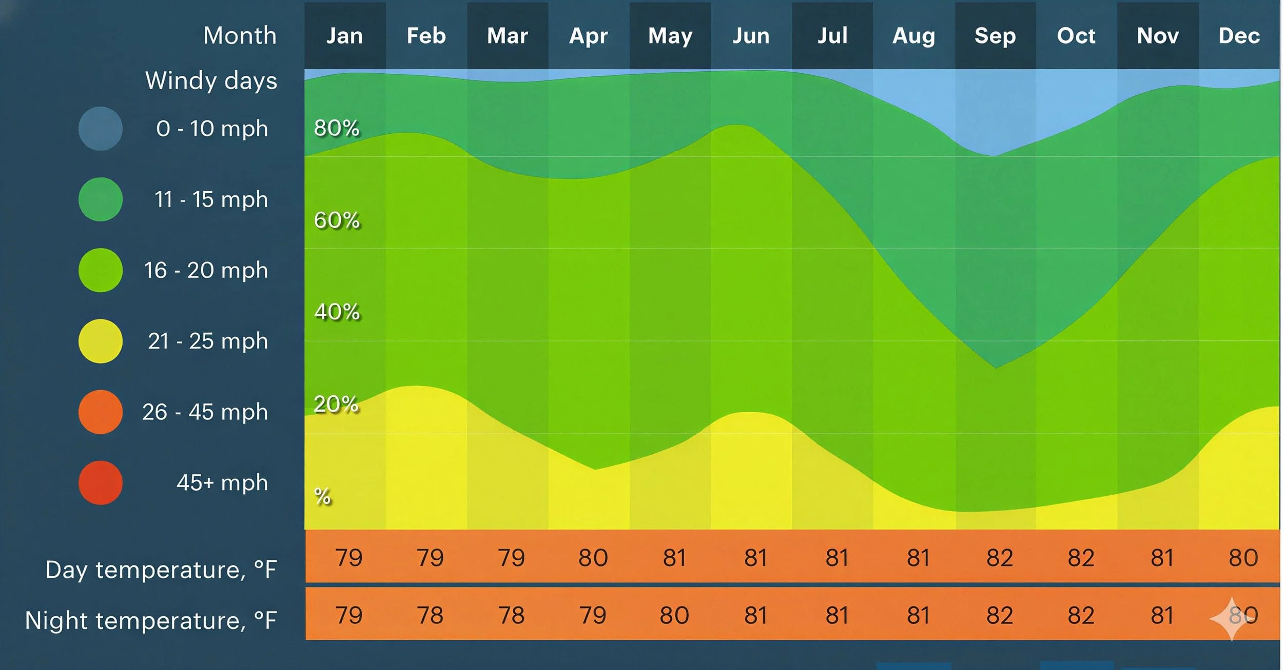Windward Mayreau benefits from one of the longest and most reliable trade wind seasons in the Caribbean. From November through July, consistent easterly winds deliver 16-20mph days up to 80% of the month (green on the chart).